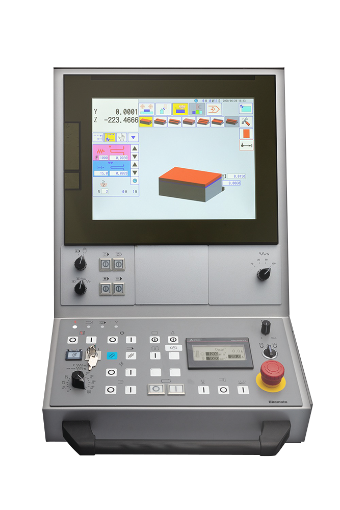 平面研削・簡易的なといし成形・ドレス条件の自動計算、文字レス対話画面の簡単データ入力で研削素人でもすぐに使える研削盤!