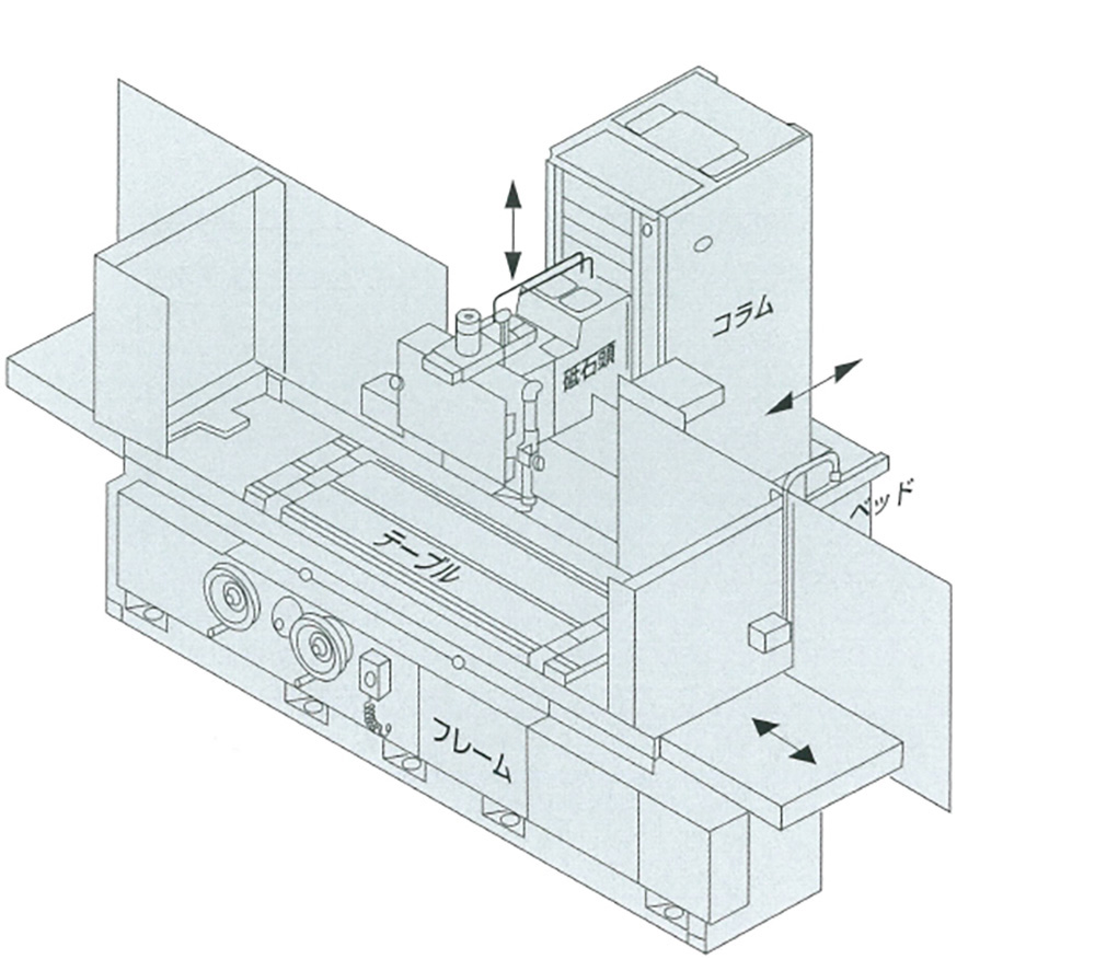 ・コラムタイプは、テーブル左右とコラム(といし頭)前後移動が独立しているので、大型・重量ワークでも前後の移動がありません。オペーレータとワーク(テーブル)の前後位置関係が常に一定なので、操作性に優れています。