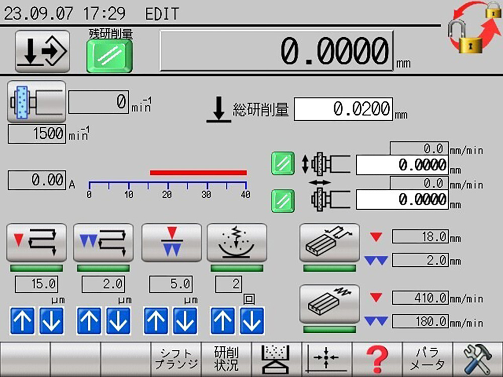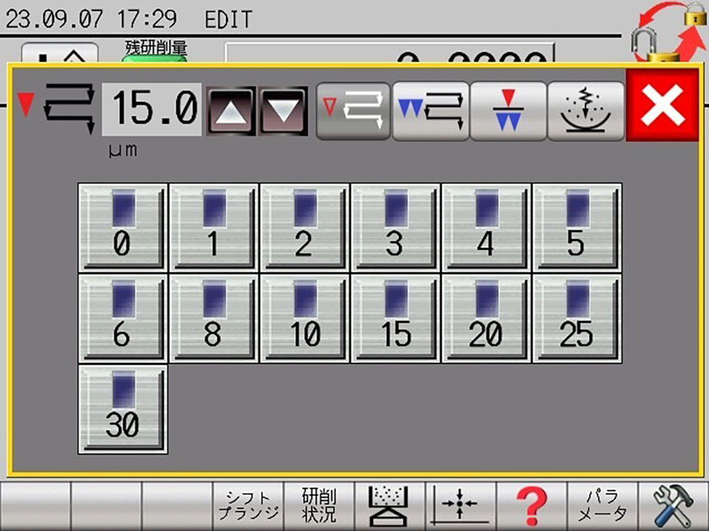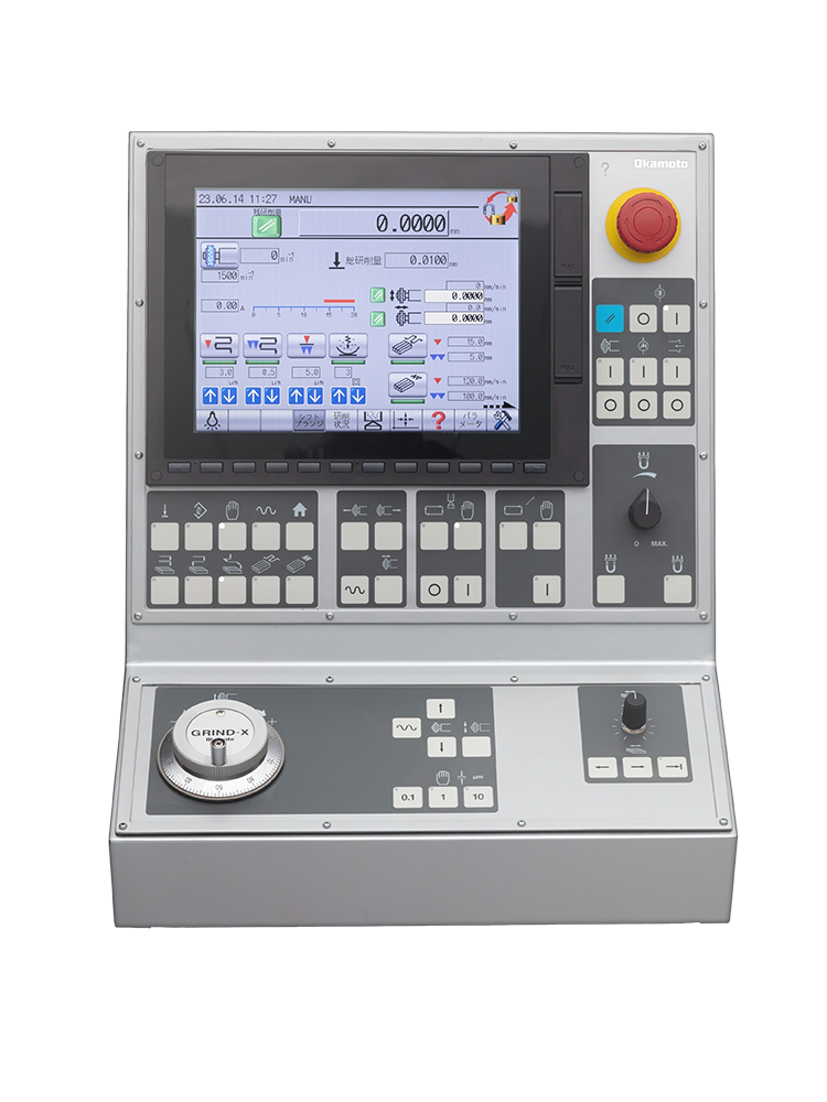・新機能、自動ドレス機能(粗加工⇒ドレス⇒精加工を自動化)とシフトプランジ機能等を追加。左右は油圧ハンドルによる汎用操作を残したまま、研削の自動化を実現しました。