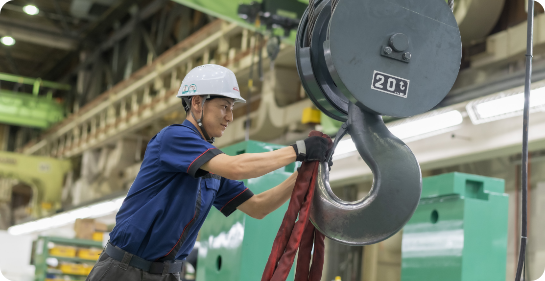 大型の工作機械の組み立て作業を担当しています。大型機械は、タイ工場から届く鋳物をもとに、日本で一から加工・塗装・下組みを行います。すべてを一から行うため、組立作業だけでも一台の完成に二〜三ヶ月を要します。
