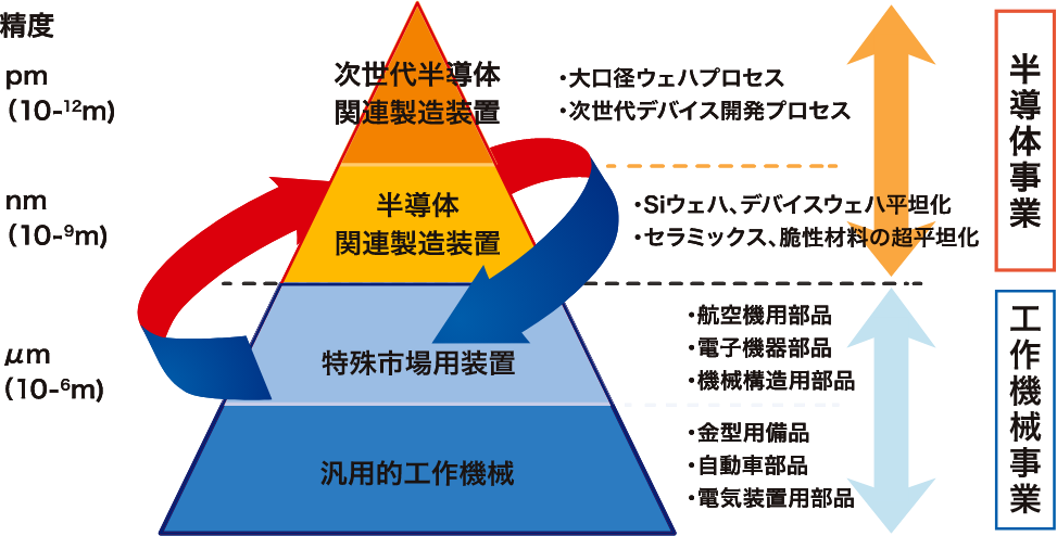 半導体事業は工作機械事業を土台として構築しています。コア技術である砥粒加工技術は半導体事業と工作機械事業の双方に必要とされる技術でもあります。